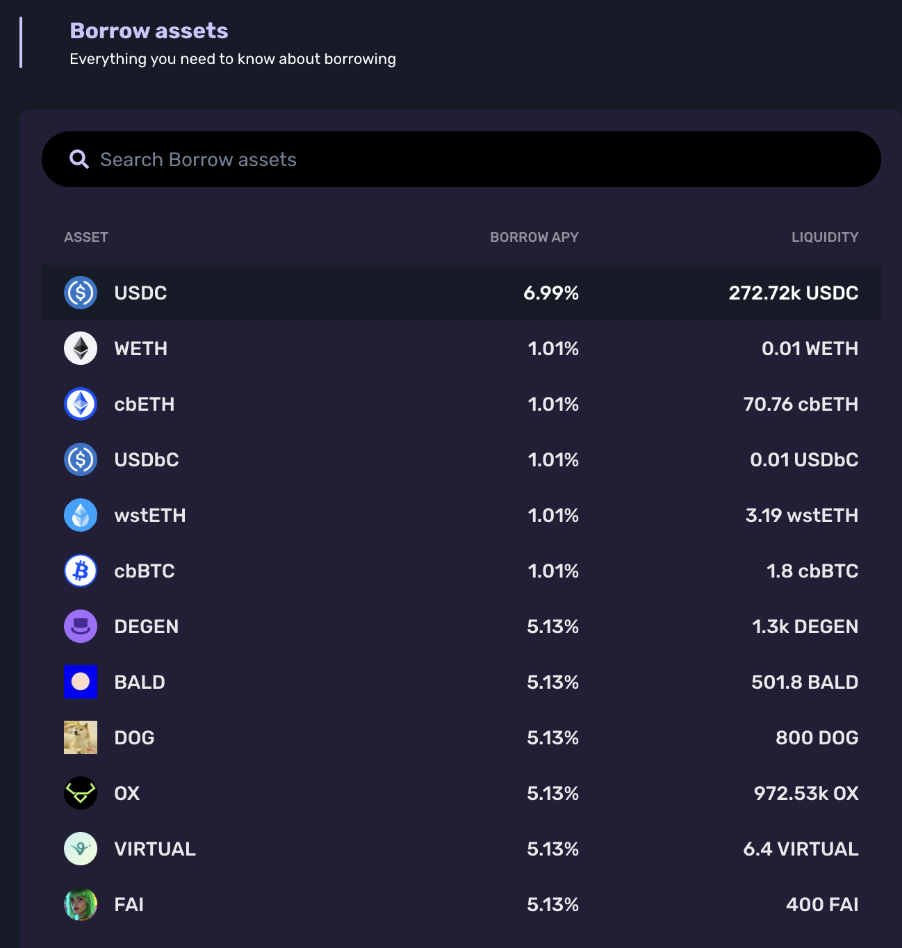 Note the Borrow APY. This is the interest you would be paying annually for your USDC loan.