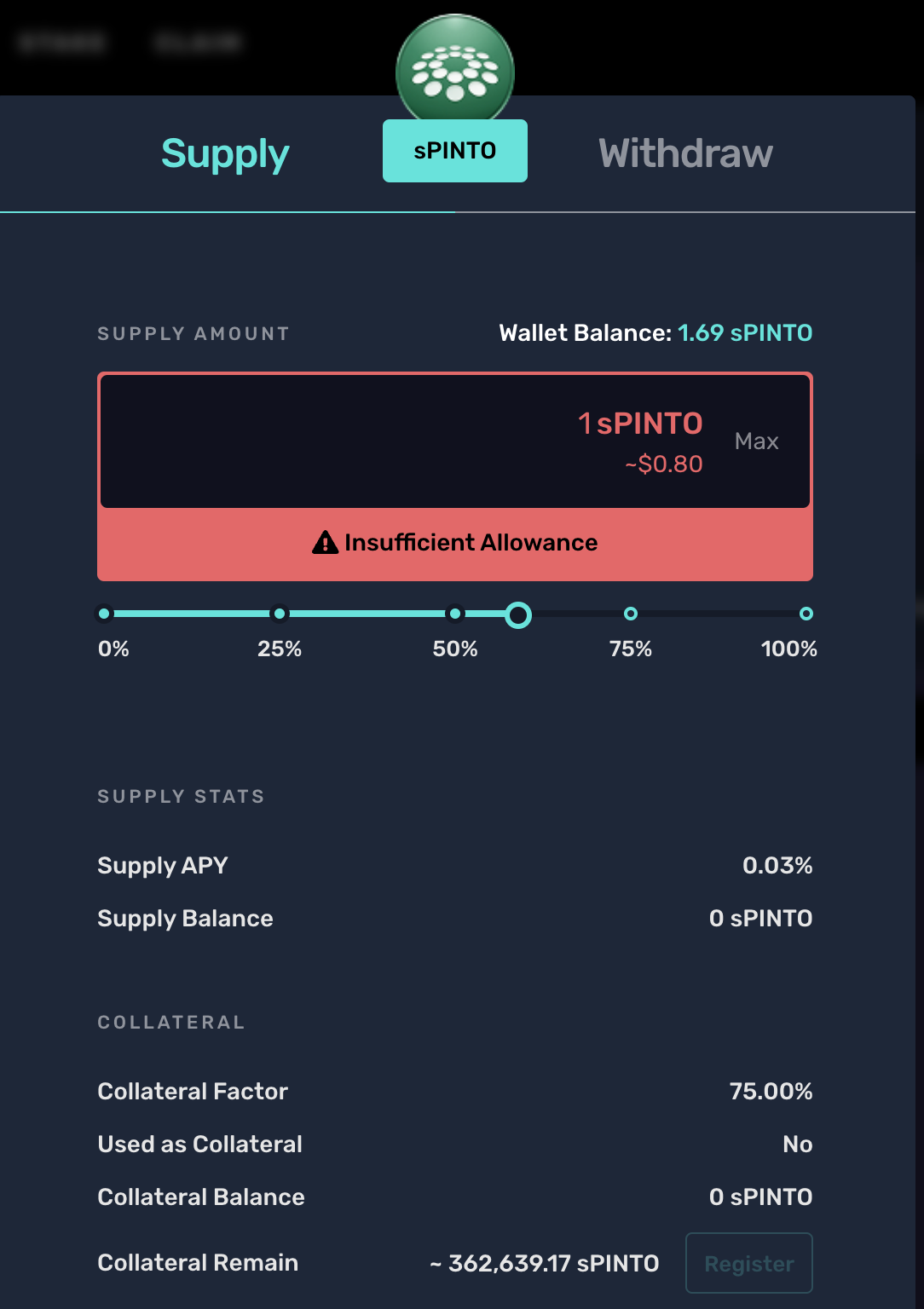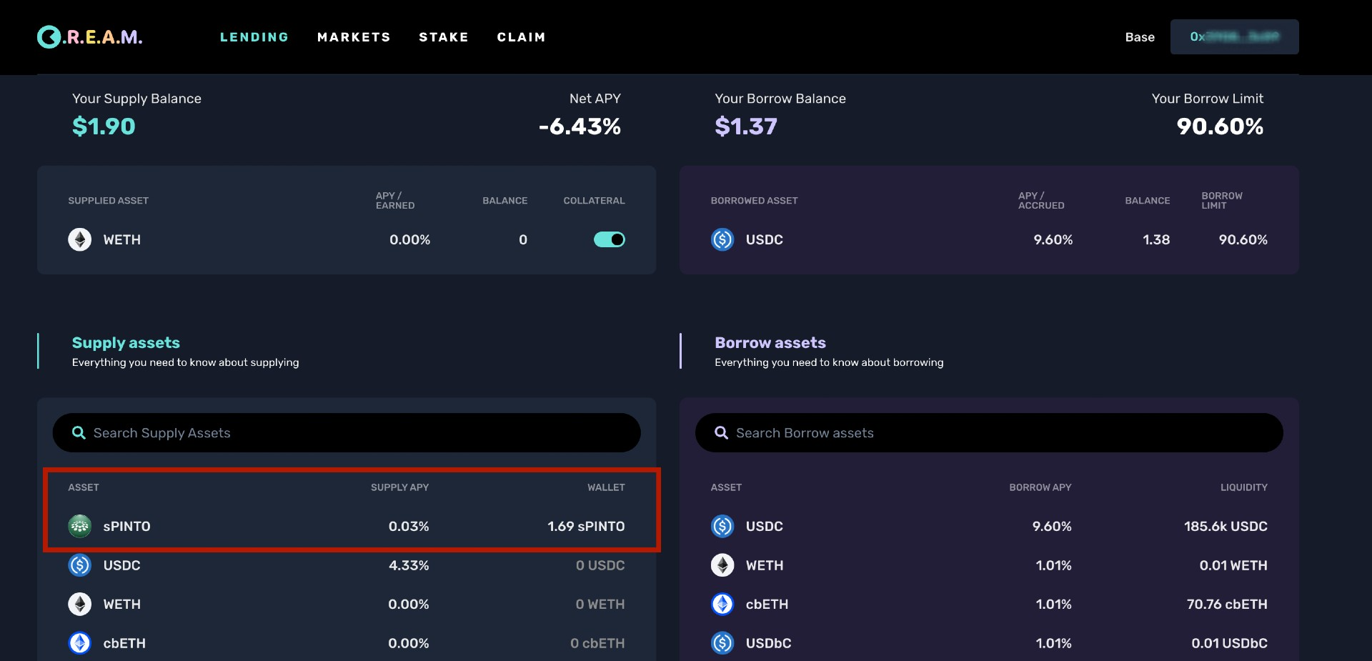 This guide will walk you through the steps to borrow and leverage against your sPinto on Cream Finance borrowing and lending markets.