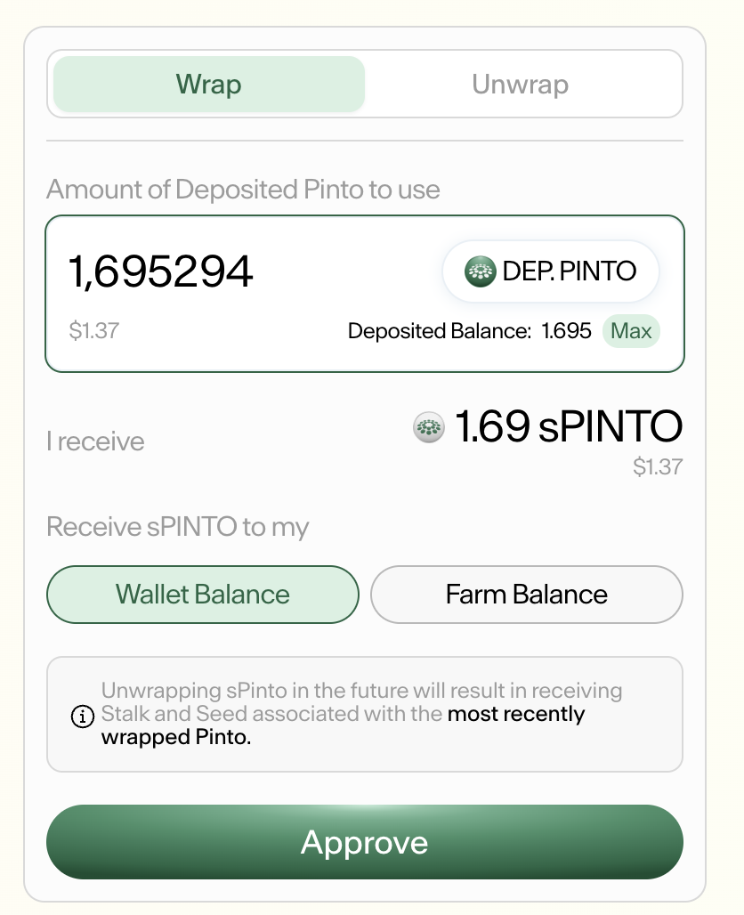 If you don’t have Pinto Deposited in the Silo, use any of the available tokens in your wallet and the UI will automatically swap them into Pinto and wrap them into sPinto.