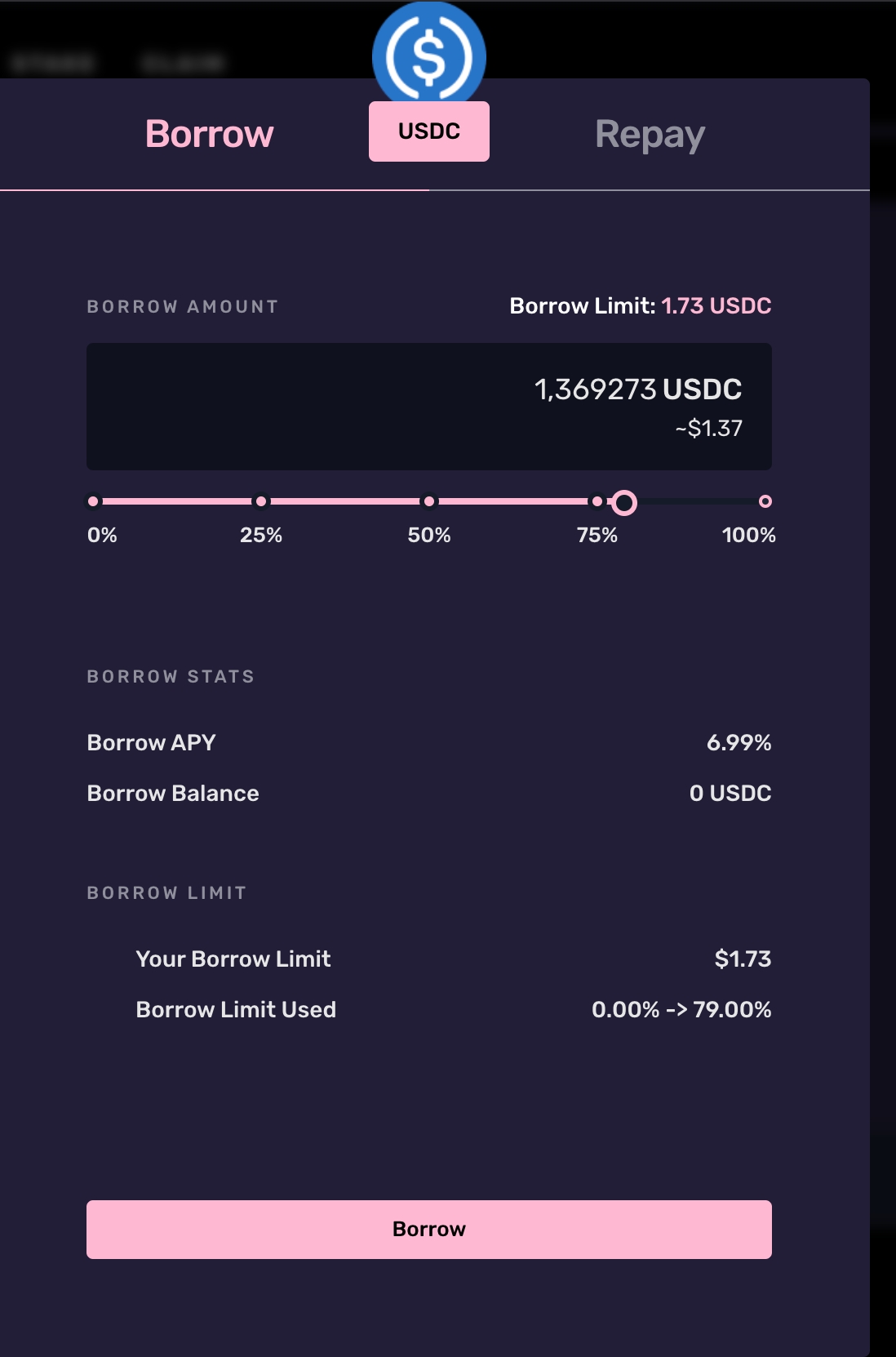 Use the slider to choose a USDC borrow amount.