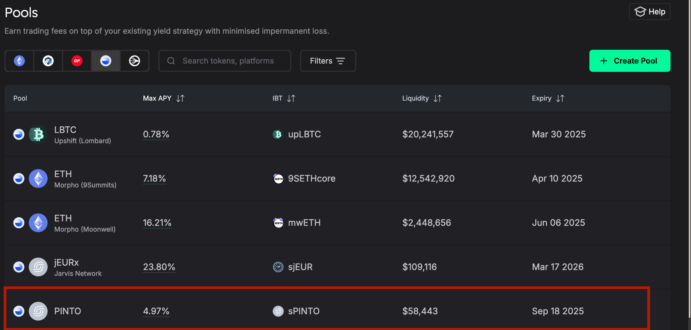 sPinto PTs and YT are traded via a Curve stableswap liquidity pool with the ratios in the pool determining the price of the tokens and thus, the underlying yield. To facilitate trading, you can provide liquidity on the sPinto spectra pool and earn swap fees and sPinto yield exposure. Pools are comprised of sPinto and the sPinto PT token. Due to the nature of the protocol, impermanent loss when providing liquidity on spectra is negligible. Read more on why this is the case here: https://docs.spectra.finance/the-basics/faq