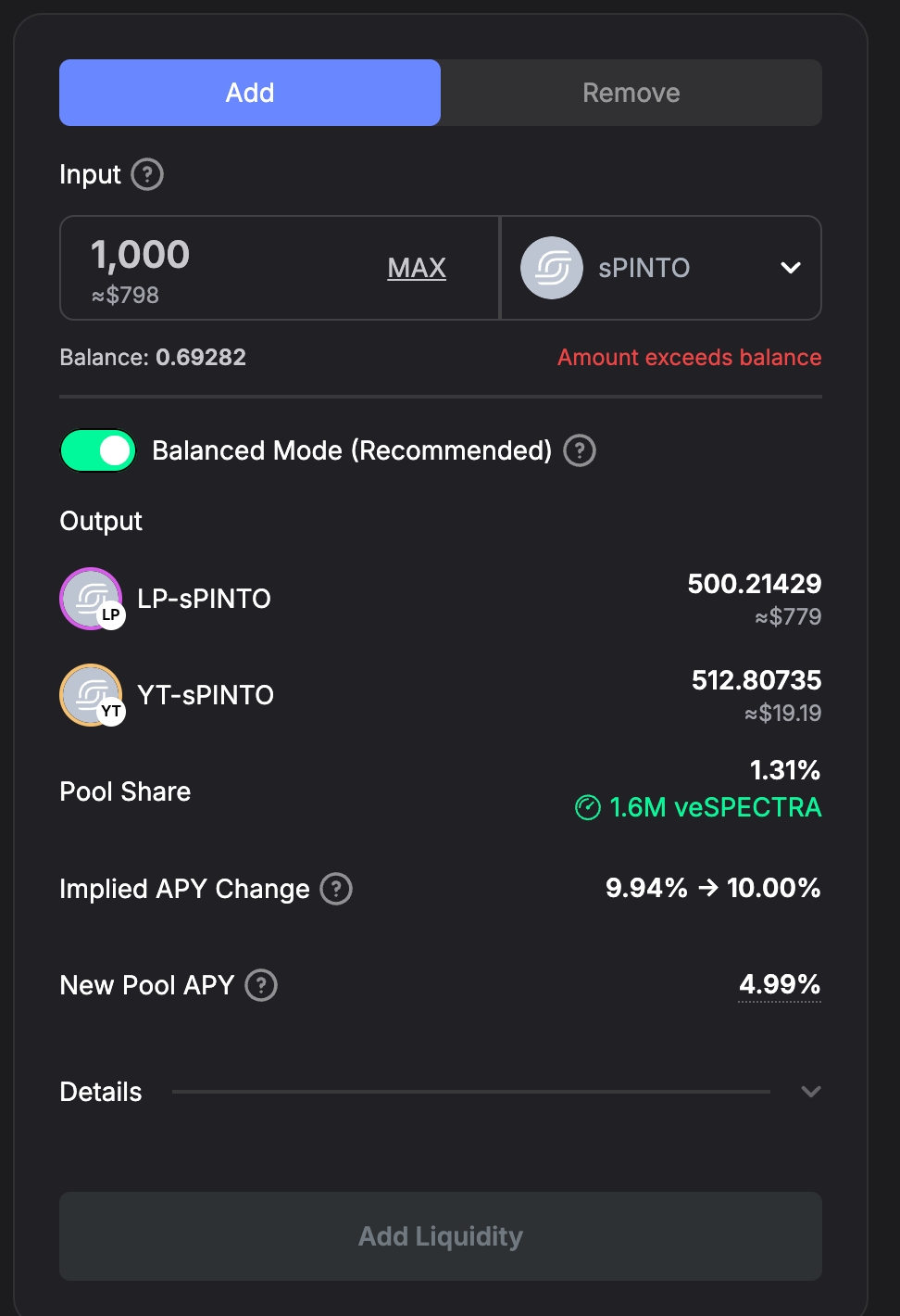 How to provide liquidity on the sPinto Spectra pool and get exposure to sPinto yield, swap fees and additional incentives.