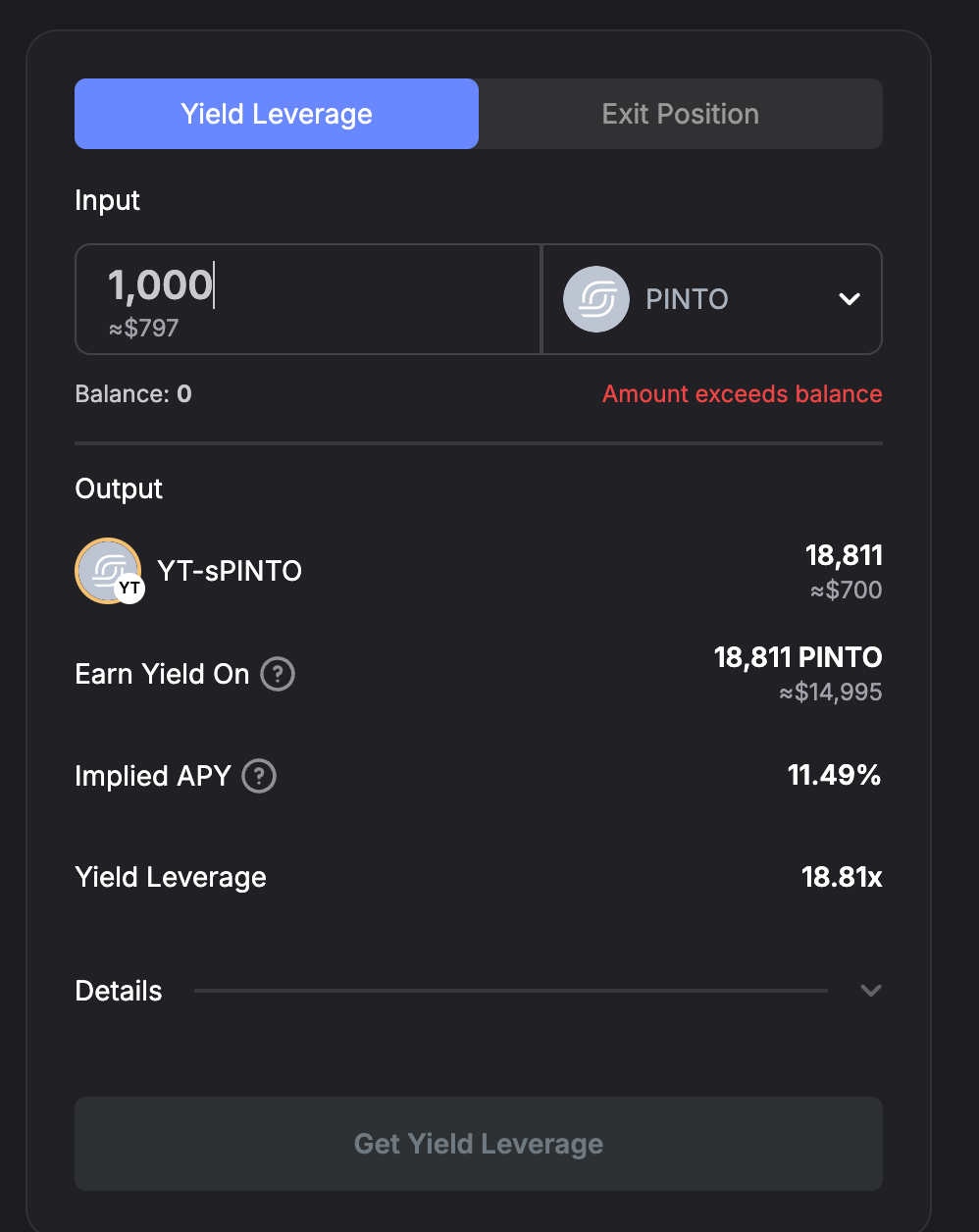 How much leveraged yield exposure you'll get when buying the sPinto YT token.