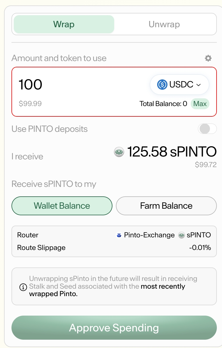 This guide will walk you through the steps to wrap and unwrap sPinto using Pinto Silo Deposits or any supported ERC20 token.