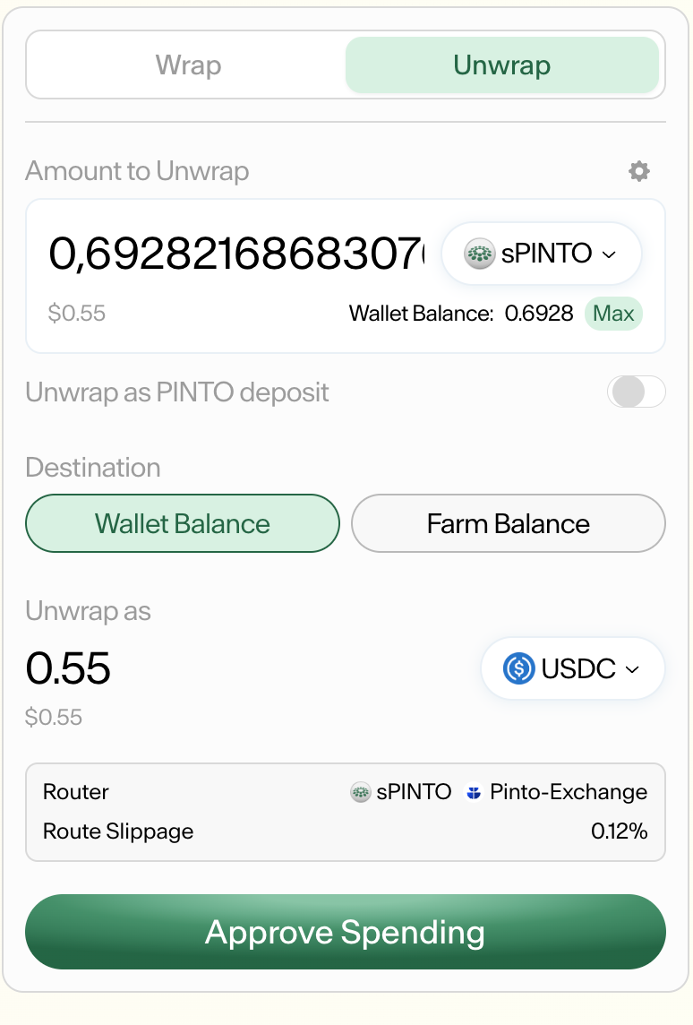 On the left, choose how you wish to use to unwrap sPinto. By pressing the toggle, you can unwrap to silo deposits or any ERC20.
