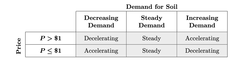 If all Soil was Sown in the first 20 minutes of the previous Season (i.e., st−1<20 minutes), demand for Soil is increasing.